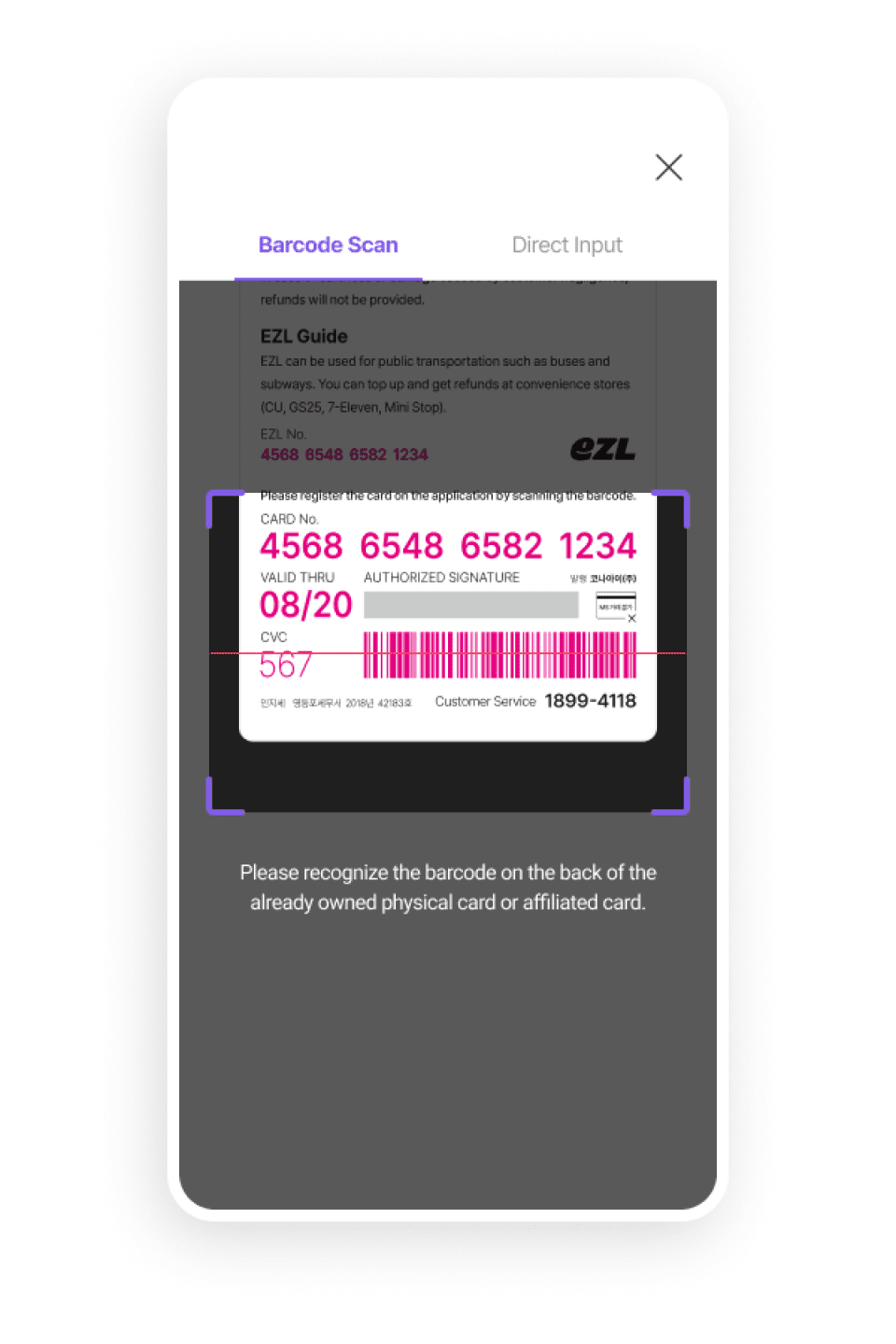 휴대폰 후면의 카메라로 구매한 카드의 바코드를 인식해주세요.